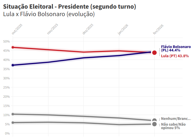BRASÍLIA – A mais recente pesquisa eleitoral do instituto Paraná Pesquisas indica um cenário de forte polarização na disputa presidencial de 2026. Pela primeira vez na série histórica do levantamento, o senador Flávio Bolsonaro (PL-RJ) aparece numericamente à frente do presidente Luiz Inácio Lula da Silva (PT) em uma simulação de segundo turno.