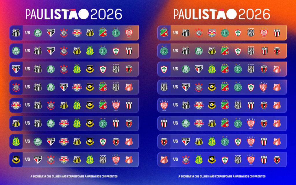 Nota: Fique atento aos clássicos! Devido ao calendário enxuto, o primeiro “Choque-Rei” (São Paulo x Palmeiras) e o “Derby” (Corinthians x Palmeiras) acontecerão logo nas primeiras semanas de competição.
