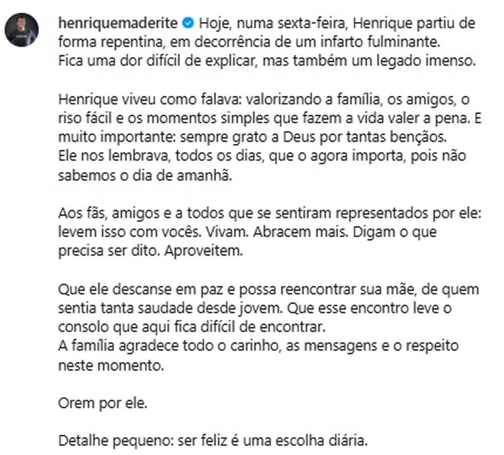 A morte do influenciador gerou grande comoção nas redes sociais. Henrique Maderite acumulava mais de 2 milhões de seguidores e era conhecido em Minas Gerais por vídeos bem-humorados, além de ações solidárias. Uma de suas campanhas mais recentes arrecadou cerca de R$ 2,6 milhões para vítimas das fortes chuvas que atingiram o estado.